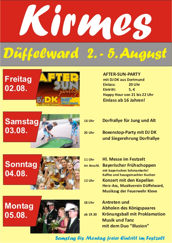 Am Sonntag, den 04.08. beginnt der Tag mit der Kranzniederlegung um 10.45 Uhr am Ehrenmal. Hierfür treten die Schützen um 10.30 Uhr am Deich an. Ab 11 Uhr findet die Hl. Messe im Festzelt statt. Um 12 Uhr beginnt der bayerische Frühschoppen mit einem Konzert des Musikverein Rheinklänge Düffelward, dem Musikzug der Freiwilligen Feuerwehr der Stadt Kleve und der Egerländerkapelle Herz-Ass. Im Festzelt ist für das leibliche Wohl bestens gesorgt. Neben bayerischen Schmankerln gibt es auch Kaffee und hausgemachten Kuchen. Für Kurzweil ist ebenfalls gesorgt. Wer möchte kann sich beim Bierkrug-Schubsen beweisen.