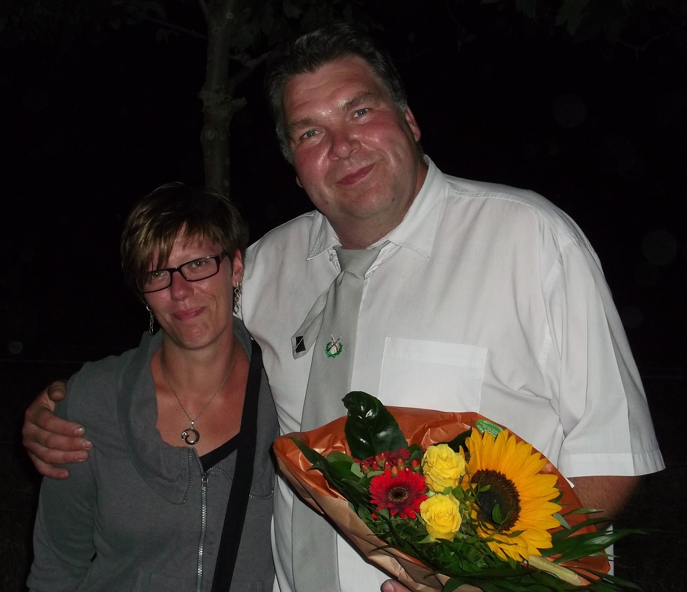 Nun hieß es Antreten zum Königschuss. Es musste ein Nachfolger für Ihre Majestät Christiane I. und Prinzgemahl Jörn I. gefunden werden. 3 Schützen traten vor um die Königswürde zu erringen. Nachdem die Feuerwehr den Vogel ausgeleuchtet hatte, war es gegen 23.30 Uhr dann soweit. Mit einem präzisen Schuss holte Hubert de Greeff den Rumpf des Vogels von der Stange. Er wird nun am Kirmesmontag als neuer Schützenkönig in Düffelward proklamiert. Als Königin steht ihm Gattin Anne zur Seite.