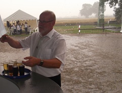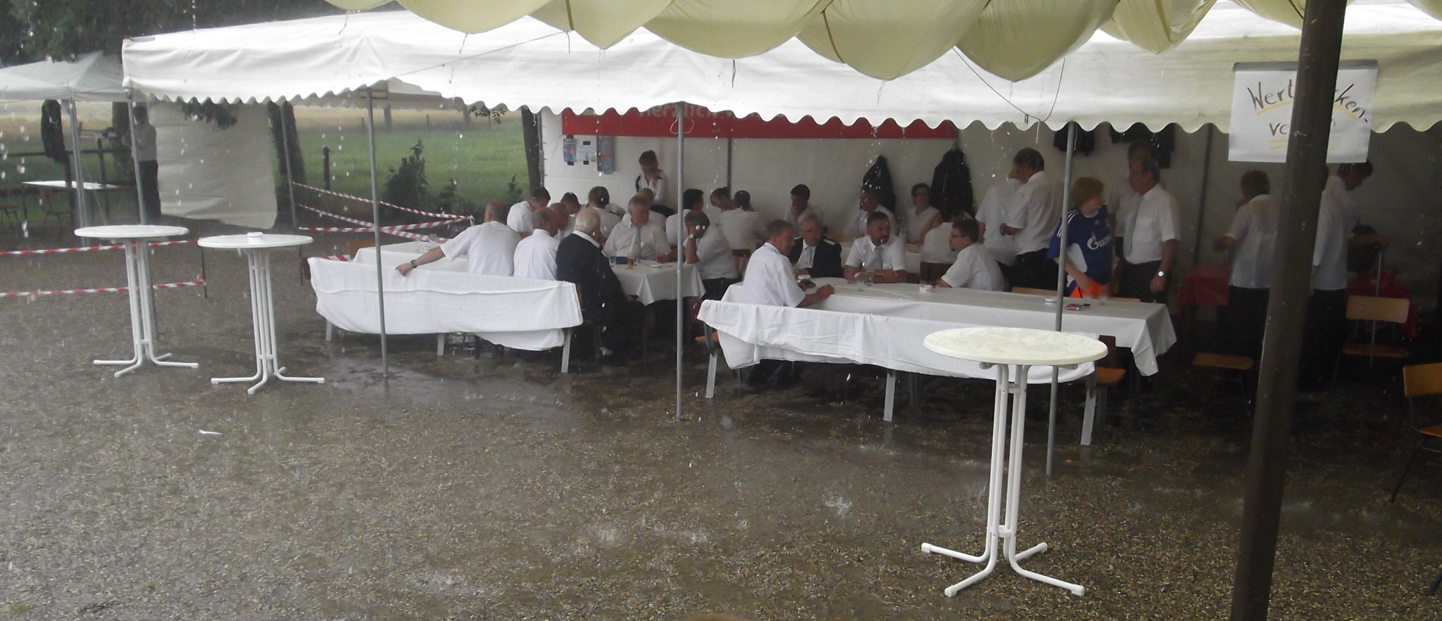 Das Wetter war schwülwarm als mit dem Schießen begonnen wurde. Kurz darauf stand der Schießplatz komplett unter Wasser. Ein Wolkenbruch mit ungewöhnlichen Ausmaßen sorgte für nasse Füße. Davon allerdings ließen sich die Schützen nicht vom Schießen abhalten. Mit hochgekrempelten Hosenbeinen wurde der Weg von der Theke zum Schießstand zurückgelegt.